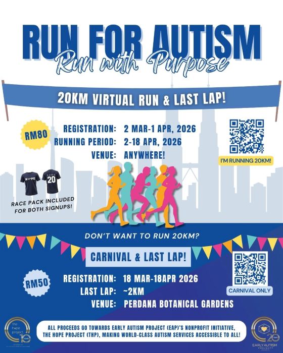 In conjunction with its 20th anniversary and World Autism Awareness Month 2026, Early Autism Project Malaysia is organising Run for Autism 2026, aimed at raising funds to expand access to autism services nationwide. The two-week virtual run will culminate in an autism-friendly charity carnival and fun run on 18 April 2026 at Perdana Botanical Gardens, Kuala Lumpur, with all proceeds going to Early Autism Project’s non-profit arm, The Hope Project.