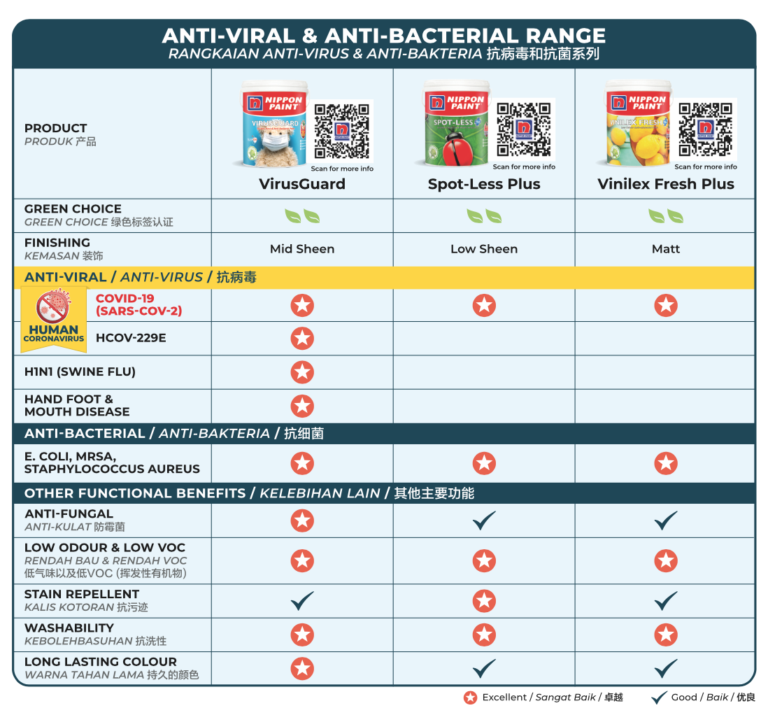 For more information on Nippon Paint’s anti-viral and anti-bacterial coating range, please visit Nippon Paint’s authorised dealers to confirm your colour choices, or browse www.nipponpaint.com.my