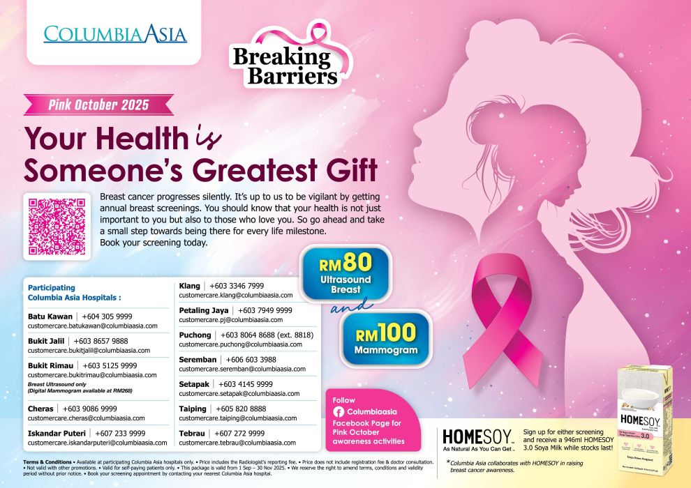 “CA is sponsoring a total amount of RM35K supporting Homesoy’s Pink October campaign ‘Stop That Dot Together’. Additionally, 1.2K units of RM25 cash vouchers will be distributed by Homesoy during roadshows and talks. The RM25 is to be redeemed on top of the current CA Pink October 2025 Breast Screening Package (Ultrasound and/or Mammogram).” – Gwen Yap, Columbia Asia Regional Marketing Manager.