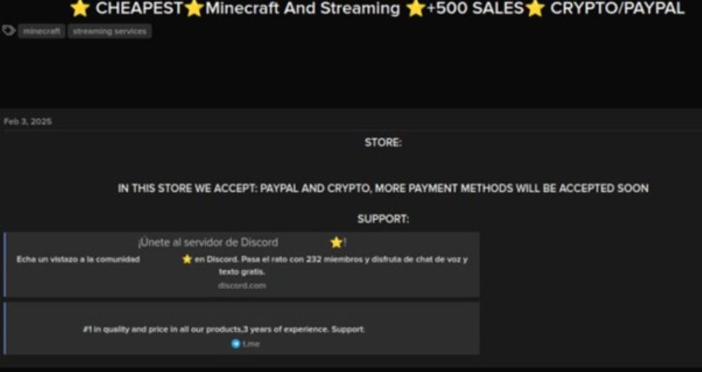 A post from a closed forum advertising a digital store, which sells access to Minecraft and streaming service accounts, boasting over 500 sales