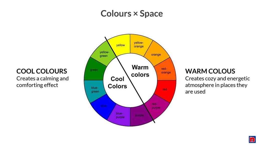 - Dominant colours (60%): Set the tone with soft neutrals or calming pastels. You can paint walls and large areas to set a serene tone.