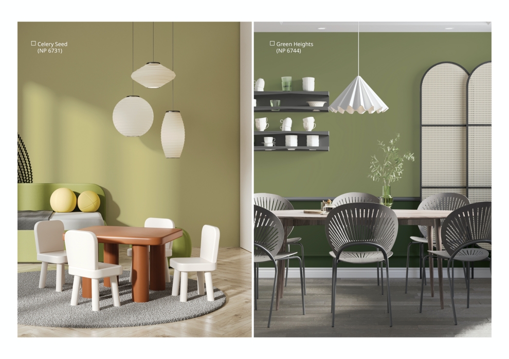 Nippon Paint’s Celery Seed (NP 6731), Green Heights (NP 6744), and Esparina (NP 6750) offer the perfect balance of freshness and serenity. These soothing tones work beautifully in living rooms, bedrooms, or even prayer spaces, perfect for creating a peaceful retreat for relaxation and reflection.