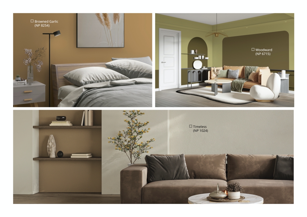 - Kitchen & Dining Area: Enhance the warmth of your Raya feasts with the inviting tones of Browned Garlic (NP 8254), paired with natural wood and gold accents for a festive touch.