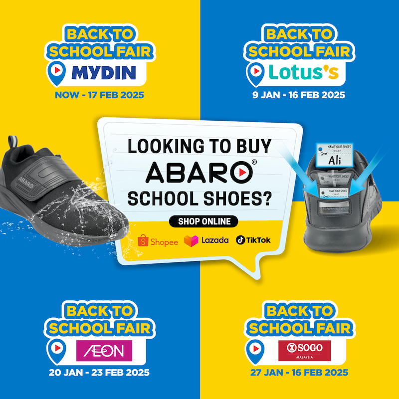 Let ABARO lighten your load this season. Shop online on Shopee, Lazada, and TikTok, or visit AEON, Mydin, Lotus, SOGO KL during the Back-to-School Fairs. You can also find ABARO at Servay Hypermarket and many other shoe stores. Because every step matters for your child’s journey.