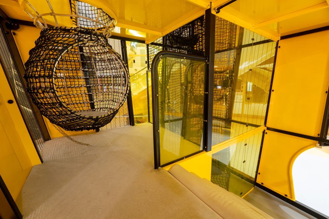 - In the hall playground featuring slides and ball pits