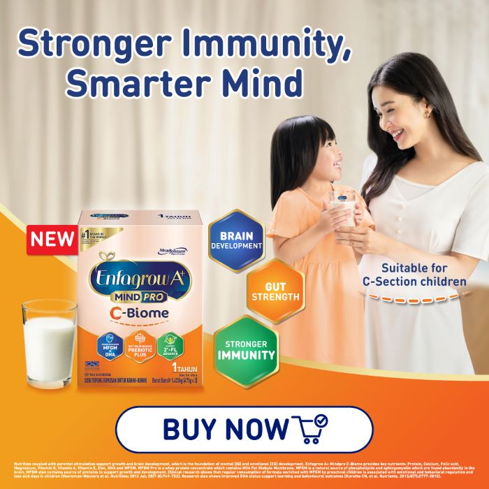 Support your C-section child’s stronger immunity and gut health today. Try Enfagrow A+ MindPro C-Biome, scientifically formulated to support stronger immunity, smarter minds in children, including C-section children. Now available at AEON, Lotus’s, Manjaku, BIG Pharmacy, Caring Pharmacy and selected Chinese Medical Halls near you.
