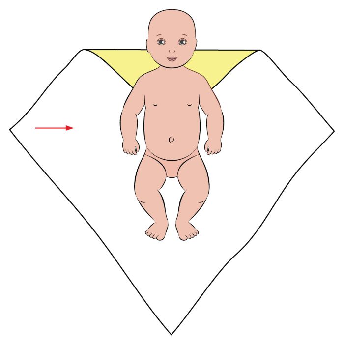Step 1: Lay the blanket in a diamond shape and fold the top corner down. Place your baby in the centre with shoulders just below the fold.