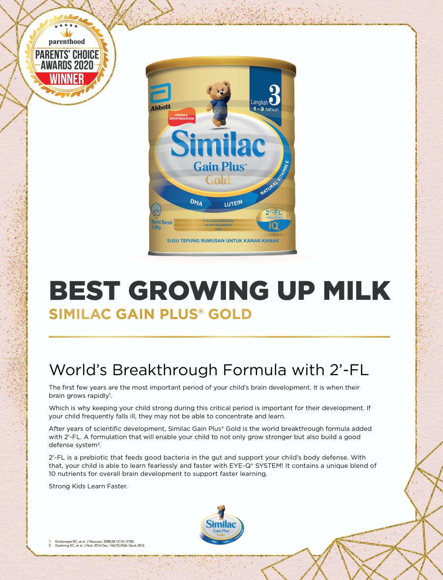 After years of scientific development, Similac Gain Plus® Gold is the world breakthrough formula added with 2’-FL. A formulation that will enable your child to not only grow stronger but also build a good defense system2.