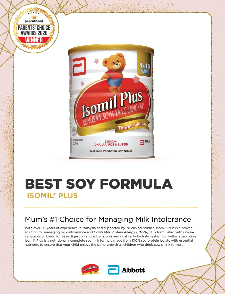 With over 50 years of experience in Malaysia and supported by 70 clinical studies, Isomil® Plus is a proven solution for managing milk intolerance and Cow’s Milk Protein Allergy (CMPA). It is formulated with unique vegetable oil blend for easy digestion and softer stools and dual carbohydrate system for better absorption. Isomil® Plus is a nutritionally complete soy milk formula made from 100% soy protein isolate with essential nutrients to ensure that your child enjoys the same growth as children who drink cow’s milk formula.
