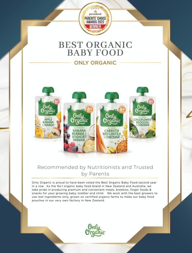 Only Organic is proud to have been voted the Best Organic Baby Food second year in a row. As the No.1 organic baby food brand in New Zealand and Australia, we take pride in producing premium and convenient meals, brekkies, finger foods & snacks for your growing baby, toddler and child. We work with the best growers to use real ingredients only, grown on certified organic farms to make our baby food pouches in our very own factory in New Zealand.