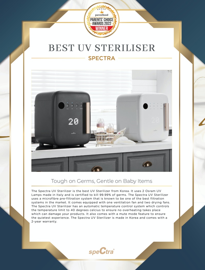 The Spectra UV Sterilizer is the best UV Sterilizer from Korea. It uses 2 Osram UV Lamps made in Italy and is certified to kill 99.99% of germs. The Spectra UV Sterilizer uses a microfibre pre-filtration system that is known to be one of the best filtration systems in the market. It comes equipped with one ventilation fan and two drying fans. The Spectra UV Sterilizer has an automatic temperature control system which controls the temperature limit to 40 degrees celcius to ensure no overheating takes place which can damage your products. It also comes with a mute mode feature to ensure the quietest experience. The Spectra UV Sterilizer is made in Korea and comes with a 2-year warranty.