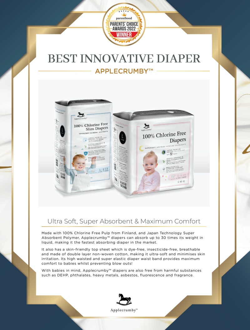 With babies in mind, ApplecrumbyTM diapers are also free from harmful substances such as DEHP, phthalates, heavy metals, asbestos, fluorescence and fragrance.