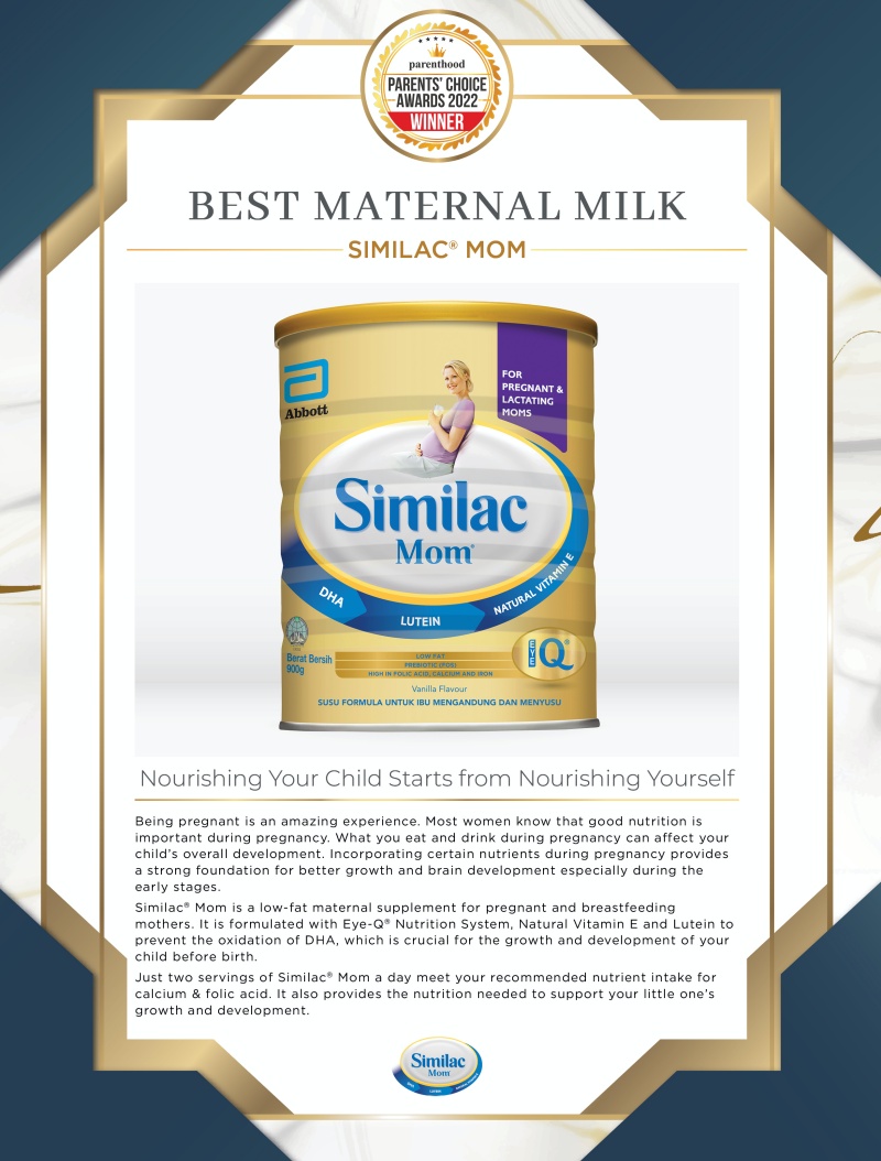 Similac® Mom is a low-fat maternal supplement for pregnant and breastfeeding mothers. It is formulated with Eye-Q® Nutrition System, Natural Vitamin E and Lutein to prevent the oxidation of DHA, which is crucial for the growth and development of your child before birth.