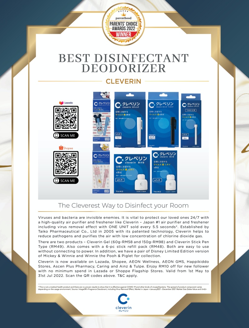 Cleverin is now available on Lazada, Shopee, AEON Wellness, AEON GMS, Happikiddo Stores, Ascen Plus Pharmacy, Caring and Ainz & Tulpe. Enjoy RM10 off for new follower with no minimum spend in Lazada or Shoppe Flagship Stores. Valid from 1st May to 31st Jul 2022. Scan the QR codes above. T&C apply.