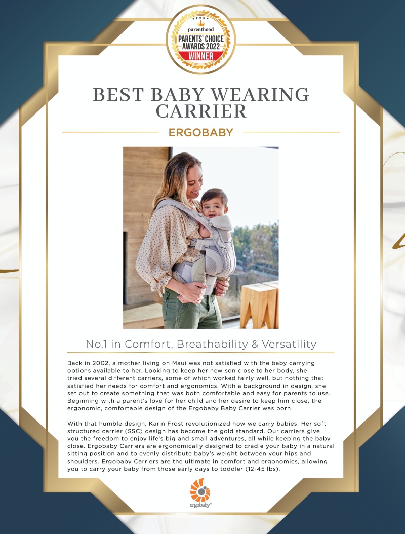 With that humble design, Karin Frost revolutionized how we carry babies. Her soft structured carrier (SSC) design has become the gold standard. Our carriers give you the freedom to enjoy life’s big and small adventures, all while keeping the baby close. Ergobaby Carriers are ergonomically designed to cradle your baby in a natural sitting position and to evenly distribute baby’s weight between your hips and shoulders. Ergobaby Carriers are the ultimate in comfort and ergonomics, allowing you to carry your baby from those early days to toddler (12-45 lbs).