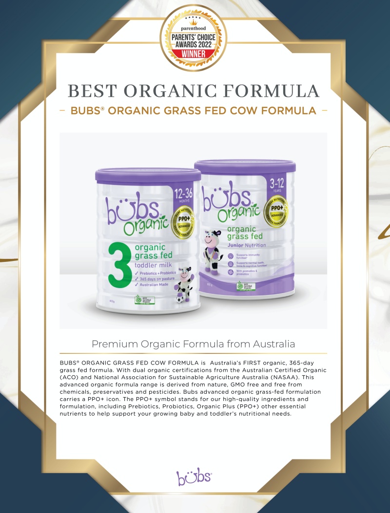 BUBS® ORGANIC GRASS FED COW FORMULA is Australia’s FIRST organic, 365-day grass fed formula. With dual organic certifications from the Australian Certified Organic (ACO) and National Association for Sustainable Agriculture Australia (NASAA). This advanced organic formula range is derived from nature, GMO free and free from chemicals, preservatives and pesticides. Bubs advanced organic grass-fed formulation carries a PPO+ icon. The PPO+ symbol stands for our high-quality ingredients and formulation, including Prebiotics, Probiotics, Organic Plus (PPO+) other essential nutrients to help support your growing baby and toddler’s nutritional needs.
