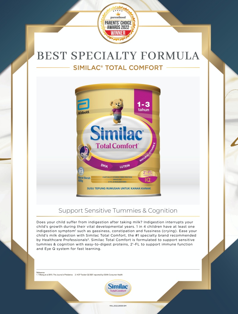 Does your child suffer from indigestion after taking milk? Indigestion interrupts your child’s growth during their vital developmental years. 1 in 4 children have at least one indigestion symptom1 such as gassiness, constipation and fussiness (crying). Ease your child’s milk digestion with Similac Total Comfort, the #1 specialty brand recommended by Healthcare Professionals2. Similac Total Comfort is formulated to support sensitive tummies & cognition with easy-to-digest proteins, 2’-FL to support immune function and Eye Q system for fast learning.