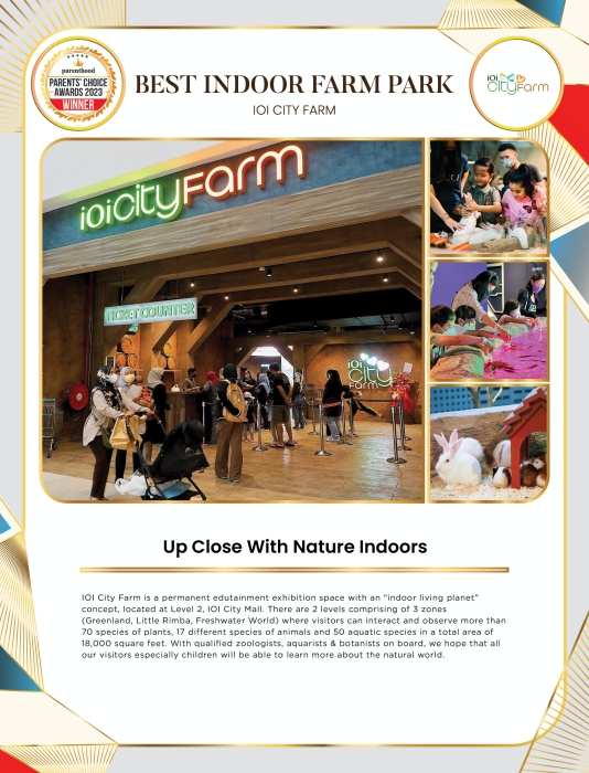 IOI City Farm is a permanent edutainment exhibition space with an “indoor living planet” concept, located at Level 2, IOI City Mall. There are 2 levels comprising of 3 zones (Greenland, Little Rimba, Freshwater World) where visitors can interact and observe more than 70 species of plants, 17 different species of animals and 50 aquatic species in a total area of 18,000 square feet. With qualified zoologists, aquarists & botanists on board, we hope that all our visitors especially children will be able to learn more about the natural world.
