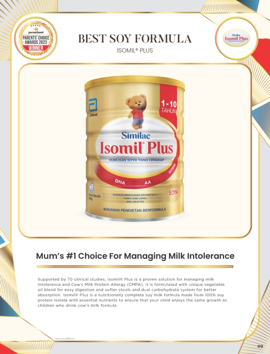 Supported by 70 clinical studies, Isomil® Plus is a proven solution for managing milk intolerance and Cow’s Milk Protein Allergy (CMPA). It is formulated with unique vegetable oil blend for easy digestion and softer stools and dual carbohydrate system for better absorption. Isomil® Plus is a nutritionally complete soy milk formula made from 100% soy protein isolate with essential nutrients to ensure that your child enjoys the same growth as children who drink cow’s milk formula.