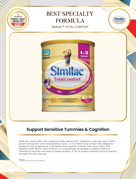 Does your child suffer from indigestion after taking milk? Indigestion interrupts your child’s growth during their vital developmental years. 1 in 4 children have at least one indigestion symptom1 such as gassiness, constipation and fussiness (crying). Ease your child’s milk digestion with Similac Total Comfort. It is scientifically formulated to support sensitive tummies & cognition with easy-to-digest proteins, 2’-FL to support immune function and Eye Q system for fast learning.