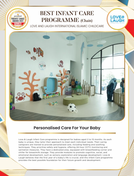 Love & Laugh Infant Care programme is designed for babies aged 2 to 15 months. As each baby is unique, they tailor their approach to meet each individual needs. Their caring caregivers are trained to provide personalised care, including feeding and soothing techniques. They prioritise safety and hygiene, offering 24-hour CCTV monitoring and sanitation measures. They have a dedicated area, equipped with breastfeeding corner and chiller for breastmilk storage.