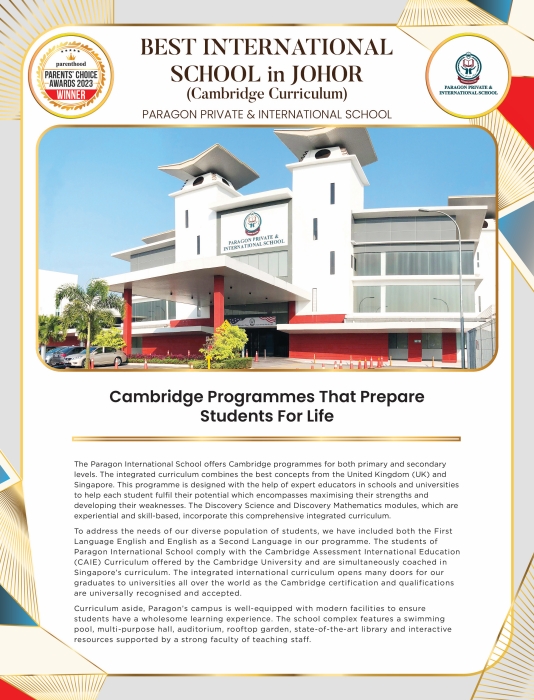 Housed within a purpose-built campus in Plentong, the Paragon Private and International School aims to nurture and develop every student in body, mind and spirit with leadership skills that will shape the world for future generations. Paragon Private School’s curriculum is based on the latest Malaysian National Syllabus offered by the Ministry of Education (MOE). Students will follow the curriculum for six years, from Primary 1 to Primary 6, before progressing to secondary school, from Form 1 to Form 5.