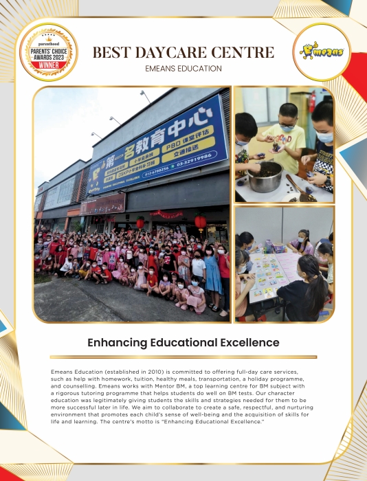 Emeans Education (established in 2010) is committed to offering full-day care services, such as help with homework, tuition, healthy meals, transportation, a holiday programme, and counselling. Emeans works with Mentor BM, a top learning centre for BM subject with a rigorous tutoring programme that helps students do well on BM tests. Our character education was legitimately giving students the skills and strategies needed for them to be more successful later in life. We aim to collaborate to create a safe, respectful, and nurturing environment that promotes each child’s sense of well-being and the acquisition of skills for life and learning. The centre’s motto is “Enhancing Educational Excellence.”
