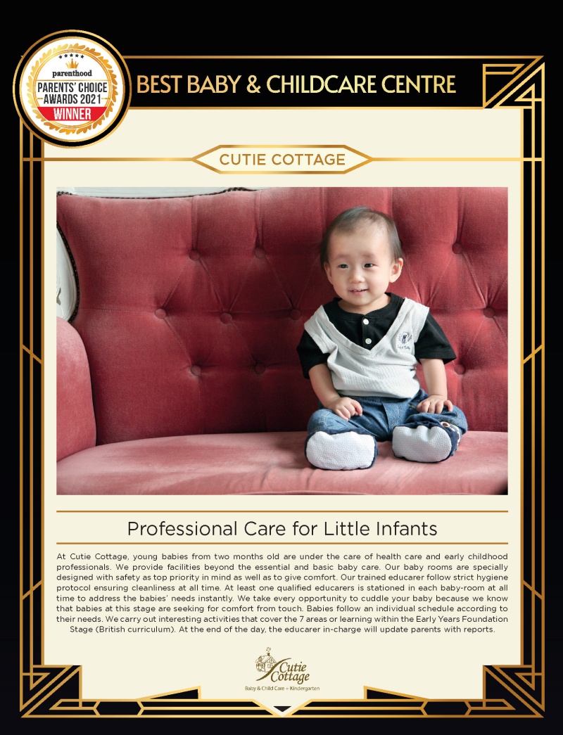 At Cutie Cottage, young babies from two months old are under the care of health care and early childhood professionals. We provide facilities beyond the essential and basic baby care. Our baby rooms are specially designed with safety as top priority in mind as well as to give comfort. Our trained educarer follow strict hygiene protocol ensuring cleanliness at all time. At least one qualified educarers is stationed in each baby-room at all time to address the babies’ needs instantly. We take every opportunity to cuddle your baby because we know that babies at this stage are seeking for comfort from touch. Babies follow an individual schedule according to their needs. We carry out interesting activities that cover the 7 areas or learning within the Early Years Foundation Stage (British curriculum). At the end of the day, the educarer in-charge will update parents with reports.