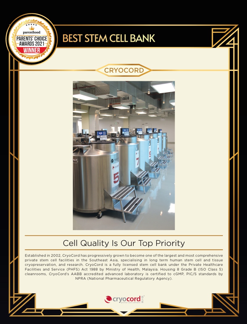 Established in 2002, CryoCord has progressively grown to become one of the largest and most comprehensive private stem cell facilities in the Southeast Asia, specialising in long term human stem cell and tissue cryopreservation, and research. CryoCord is a fully licensed stem cell bank under the Private Healthcare Facilities and Service (PHFS) Act 1988 by Ministry of Health, Malaysia. Housing 8 Grade B (ISO Class 5) cleanrooms, CryoCord’s AABB accredited advanced laboratory is certified to cGMP, PIC/S standards by NPRA (National Pharmaceutical Regulatory Agency).